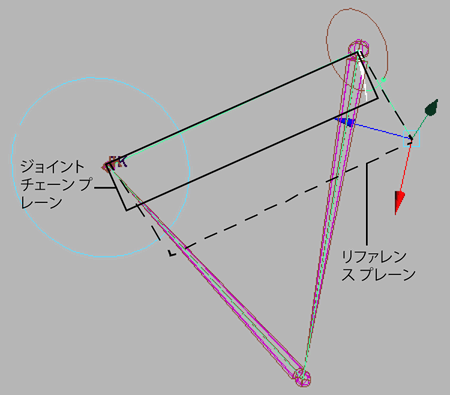 ジョイント チェーンの全ジョイントを含み、軸を使用してポーズを設定するプレーンがジョイント プレーンです。ジョイント チェーン プレーンは、ハンドル ベクトルの周りで回転します。極ベクトルを操作する場合は、ハンドル ベクトルの周りでジョイント チェーン プレーンを回転させます。