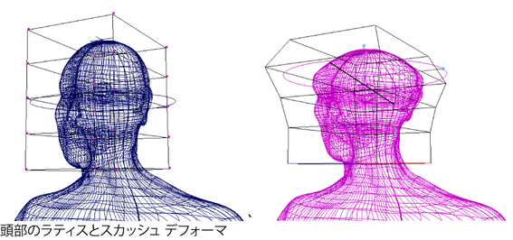 デフォーマはアニメーション ツールとして使用できます。デフォーマを作成し、ターゲット オブジェクトをデフォーマで微調整し、時間に沿ったデフォーマのアトリビュートにキーを設定してアニメーションを作成できます。たとえば、フェースのモデルのためにブレンド シェイプ デフォーマを作成できます。シェイプ エディタ(Shape Editor)でブレンド シェイプ デフォーマのターゲット シェイプのウェイトを時間をかけて操作およびキー設定すると、顔のアニメーションを作成できるようになります。