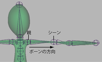 親ジョイントとは、スケルトンの階層内で上位に位置し、それよりも下位のジョイントの動作に影響を及ぼすジョイントをいいます。スケルトン階層内で親ジョイントの下位にあるジョイントを子ジョイントと呼びます。ボーンの最上部のジョイントは必ず親となり、ボーンの最下部のジョイントは必ず子となります。親ジョイントは、それぞれの子ジョイントのトランスフォームを駆動します。このため、親ジョイントを移動または回転させると、すべての子ジョイントも移動または回転します。