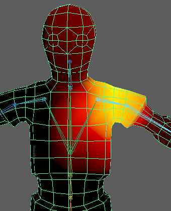 次の図では、スキン ウェイト ペイント(Paint Skin Weights)ツールを使用して最短距離(Closest Distance)バインド方法の効果を示します。中心の黄色の領域はインフルエンスが最も強いことを示し、黒い領域はメッシュ全体に広がるにつれてバインドの効果が減少することを示します。このバインド方法を使用した場合、既定の設定では肩のインフルエンスが最も強くなりますが、インフルエンスは頭の上まで広がっています。最短距離(Closest Distance)と階層内の最近接(Closest in Hierarchy)の図を比較すると、効果は両方で同じようになりますが、階層内の最近接(Closest in Hierarchy)の方が胸領域全体に完全に広がっています。