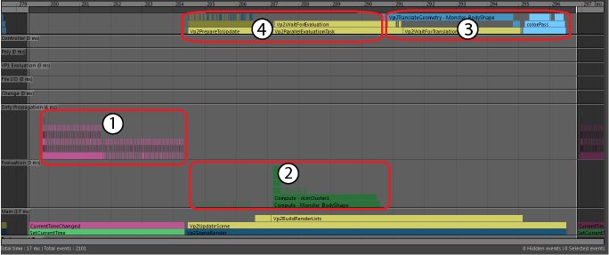 - 黄褐色および茶色の EM 並列評価イベントは、Maya が変形したメッシュを計算するためにスキン クラスタを評価するときに発生します。ディペンデンシー グラフには並列性がないため、これらのイベントは順次発生します。
