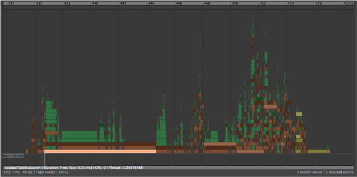 - 複数のクラスタを同時に評価できますが、サイズの大きなクラスタでは同時に実行できる作業量が制限されます。プロファイラでは、クラスタは以下に示すように opaqueTaskEvaluation ラベルを持つバーとして識別できます。