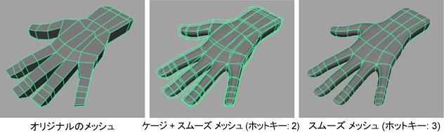 既定では、メッシュはスムーズ メッシュ プレビュー(Smooth Mesh Preview)がオフの状態で自動的に表示されます。スムーズ メッシュ プレビュー(Smooth Mesh Preview)を有効にすると、オリジナル メッシュとスムーズ プレビューを同時に表示することや(ケージ + スムーズ メッシュ(Cage + Smooth Mesh)表示モード)、スムーズ プレビュー自体を表示できます(スムーズ メッシュ(Smooth Mesh)表示モード)。