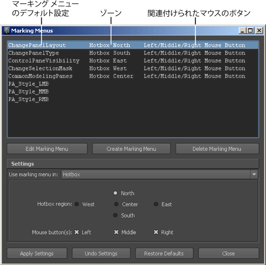 マーキング メニューの使用(Use Marking Menu in)オプションでホットボックスを選択した場合は、マーキング メニューを表示させるホットボックス(Hotbox)のゾーンを北(North)、南(South)、東(East)、西(West)、センター(Center)の中から選択します。