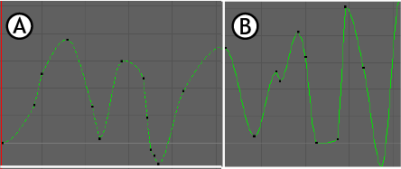 最新のグラフ エディタ(Modern Graph Editor)のアニメーション カーブ: A.参照、ロック、B. 参照、ロック解除