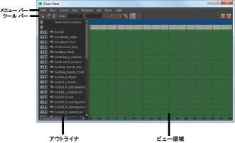 ドープシート(Dope Sheet)エディタには、メニュー バー、アイコン、アウトライナ、ビュー領域が含まれています。