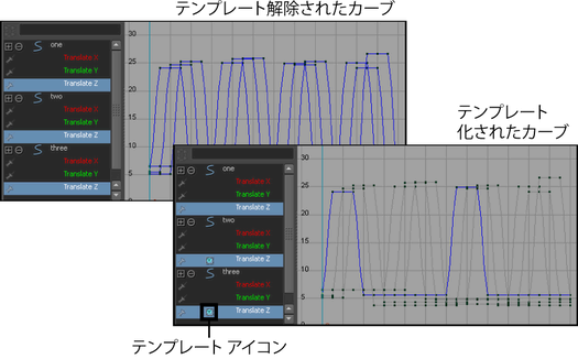 アニメーション チャネルをテンプレート化した場合、そのキーは引き続き、オブジェクトの全体的なアニメーションで使用されますが、グラフ ビューのカーブとキーは選択できなくなります。また、アウトライナにはテンプレート化したチャネルの隣には小さな アイコン、グラフ ビューにはテンプレート化したチャネルのカーブがグレーで表示されます。