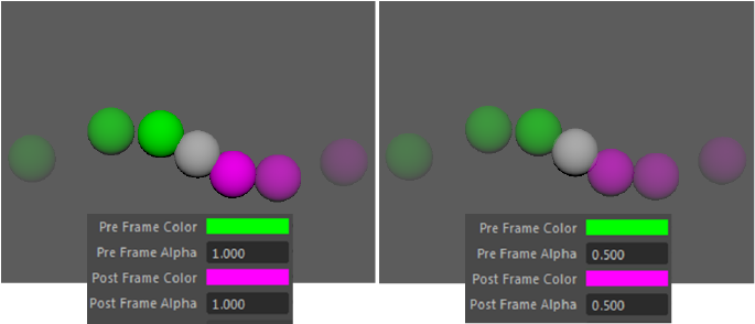 プリ フレーム アルファ(Pre Frame Alpha)は、現在のフレームの前のゴーストの最大不透明度をコントロールし、ポスト フレーム アルファ(Post Frame Alpha)は現在のフレームの後のゴースト最大不透明度をコントロールします。