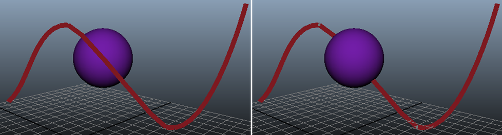 - 軌跡のカラー(Trail Color)と追加奇跡カラー(Extra Trail Color)の設定によって定義された色で区別することにより、現在のフレームの前後にどのアニメーションが発生するのかを確認できます(「モーション軌跡のカラーとサイズの設定」を参照してください)。標準のモーション軌跡のカラーで現在のフレームの後に発生するアニメーション。