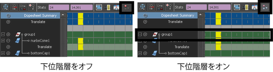 たとえば、次の図では、円錐の移動 X (Translate X)チャネルがアニメーションのないグループの下に置かれています。下位階層(Hierarchy Below)をオンにすると、group1 ノードは概要グループとして動作し、子ノード(円錐)のアニメーション情報が表示されます。下位階層(Hierarchy Below)をオフに設定した場合は、集計オブジェクト(ドープシートの集計(Dopesheet Summary)、シーンの集計(Scene Summary))のみに集計された情報が表示されます。