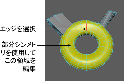 トポロジ シンメトリでないメッシュ上でトポロジ シンメトリを有効にすると、部分トポロジ シンメトリが既定でアクティブ化します。メッシュ全体がシンメトリでない場合にも、部分トポロジ シンメトリを使用してシンメトリなメッシュのパーツを編集することができます。