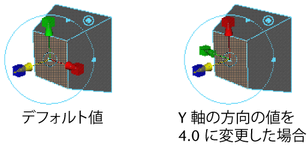 ローカル空間における基準となる X 軸を決定する方向を定義します。次の図は、Y 軸の方向の値を 4.0 に変更したときのマニピュレータハンドルの変化を示します。