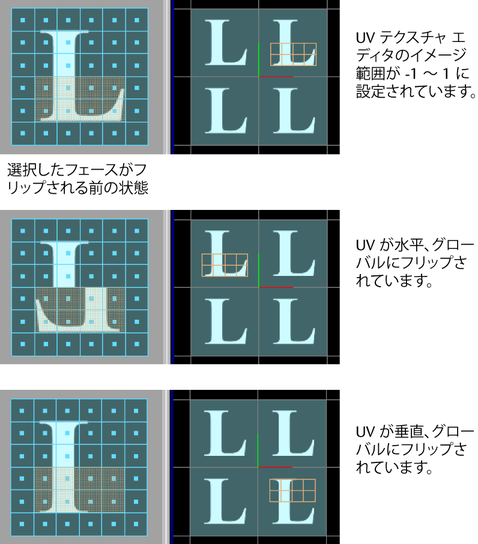 UV > 反転(UV > Flip)を選択したときの動作を設定するには、これらのオプションを使用します。