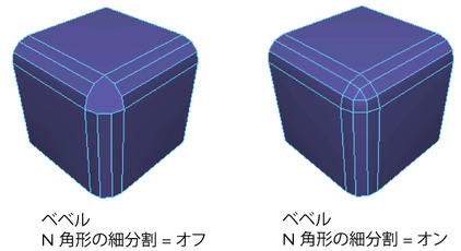 複数のセグメントに対するベベル操作を実行した結果として、多数のエッジを持つフェースを細分割します。N 角形の細分割(Subdivide Ngons)オプションは既定でオンにされており、チャネル ボックス(Channel Box)内でオフにコントロールすることもできます。