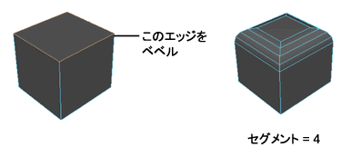 セグメント(Segments)の値は、ベベルされたポリゴンのエッジに沿って作成されるセグメントの数を指定します。スライダを使用するか、値を直接入力してセグメント数を指定します。既定は 1 です。