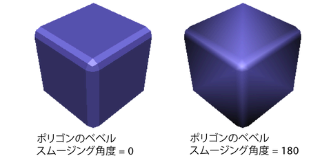 ベベルしたエッジを柔らかくする場合は、スムージング角度(Smoothing Angle)を大きい値(180 など)に設定します。ベベルしたエッジを硬くする場合は、スムージング角度(Smoothing Angle)を小さい値(0 など)に設定します。