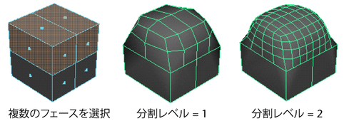 分割レベル(Division levels)とフェースごとの分割数(Divisions per Face)の両方の設定を変更すればメッシュ上に非常に多くのフェースを作成できますが、Maya アプリケーションのインタラクティブなパフォーマンスは低下します。