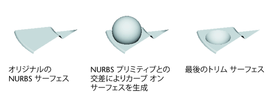 NURBS サーフェスは本質的に 4 辺のパッチで、ポリゴン サーフェス タイプと同じ方法で穴を作成することはできません。サーフェスをトリミングすることにより、NURBS を使用して不規則なシェイプや穴を視覚的にシミュレートすることができます。