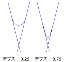 深度(Depth)の値が高くなるほど、フィレット カーブの位置は交差ポイントに近づきます。