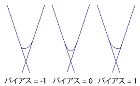 2 つのカーブのどちら側にフィレット カーブを偏らせるかを制御します。値を 1 にするとフィレット カーブは一方のカーブ側に偏り、-1 にするともう一方のカーブ側に偏ります。値を 0 にすると、2 つのカーブの間で偏りはなくなり均等に配置されます (アトリビュート エディタ(Attribute Editor)では 0 未満の値を指定できますが、オプション ウィンドウでは指定できません)。