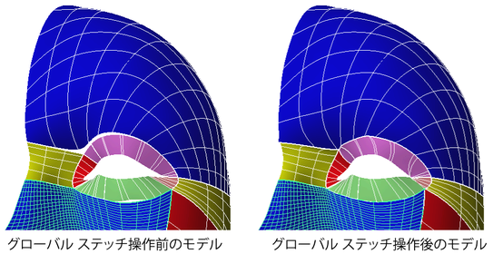 グローバル ステッチ(Global Stitch)は、デフォメーションによってエッジが分離してしまう可能性がある状況において、アニメーション中に隣接サーフェスが分割されるのを防ぐのに便利です。グローバル ステッチは、2 つまたは 3 つの隣接サーフェスを一緒に自動ステッチすることによって機能します。各サーフェスは、ステッチされても個別の構成要素として残ります。サーフェス エッジ間のリレーションシップを維持するために、グローバル ステッチ(Global Stitch)ノードが作成されます。グローバル ステッチ(Global Stitch)では、ステッチ操作の一部として隣接サーフェス内の小さなギャップを閉じることもできます。