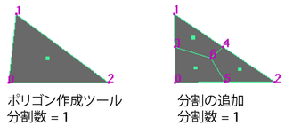 分割数(Divisions)オプションを設定するのは、メッシュの編集(Edit Mesh) > 分割の追加(Add Divisions)を使用してポリゴンを細分割するのとは異なります。分割数(Divisions)では、ポリゴンは n 辺になります。分割の追加(Add Divisions)操作を使用した場合は、既定で新しいフェースが作成されます。新しい頂点を作成するには、エッジだけを特別に細分割する必要があります(詳細については、ポリゴン エッジを分割するを参照)。