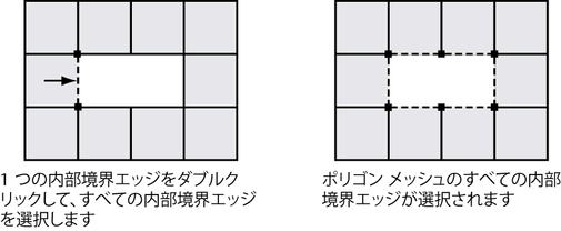 - メッシュの内部境界エッジを選択する場合、ポリゴン メッシュの 1 つの内部エッジをダブルクリックします。