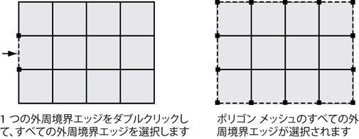 - メッシュの外周境界エッジを選択する場合、ポリゴン メッシュの 1 つの外周エッジをダブルクリックします。