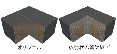 パッチ(Patch)に似ていますが、バベル エッジの頂点をバベルされていないエッジの頂点に接続するのではなく、コーナーに円弧が作成されます。