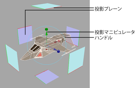 チャネル ボックス(Channel Box)を使用して、投影マニピュレータの変換をリセットすることができます。投影のロード(Load Projection)オプションを使用してカスタム投影オブジェクトを指定すると、投影マニピュレータは更新されて、カスタム投影によって指定されたプレーンが反映されます。
