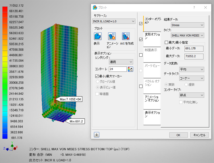 5. [コンター オプション]タブをクリックします。[結果データ]を[応力]に変更して、[タイプ]を[SHELL MAX VON MISES STRESS BOTTOM/TOP] (シェル最大フォンミーゼス応力下/上)に変更します(結果が更新されない場合は、[表示]をクリックします)。