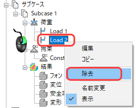 荷重を除去するには、ツリーでその荷重を右クリックして、[除去]を選択します。モデル内で目的の条件が上の図のようにハイライト表示されるのを確認して、荷重を正しく選択してください。