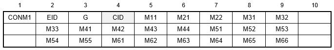 | CID | Coordinate system identification number for the mass matrix. | Integer ≥ 0 | 0 |
