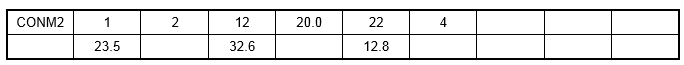 | X1, X2, X3 | Offset distances from the grid point to the center of gravity of the mass in the coordinate system defined in field 4, unless CID = -1, in which case X1, X2, X3 are the coordinates of the center of gravity of the mass in the basic coordinate system. | Real or blank | 0.0 |