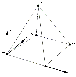 The origin is located at the midpoint of a straight line joining points G1-G4. The x-axis passes through the midpoint of a straight line joining G2-G5. The z-axis is normal to a plane passing through the midpoints of straight lines joining G1-G4, G2-G5, and G3-G6.