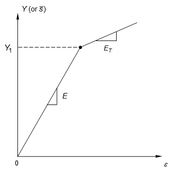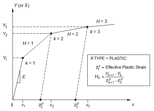 | H | Work hardening slope (slope of stress vs. plastic strain) in units of stress. For more than a single slope in the plastic range, the stress-strain data must be supplied on a TABLES1 entry referenced by TID, and this field must be blank. See Remark 2. | Real | |||||