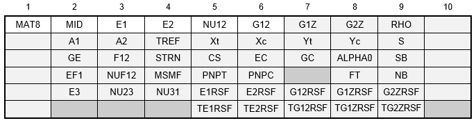 | MID | Material identification number. Referenced on a PSHELL or PCOMP entry only. | Integer > 0 | Required | ||||||||||||