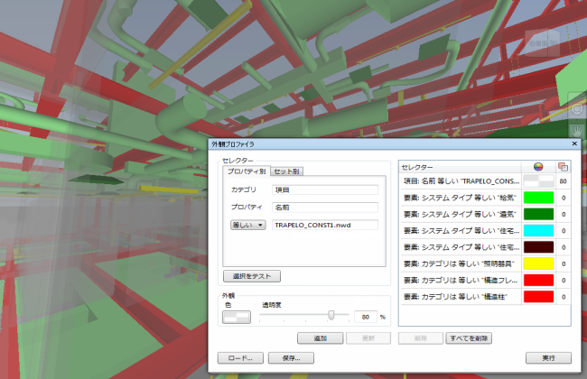 最初のセレクタを使ってモデル全体の色を透明度 80% の灰色にしておくと、他の色の上書きを適用したオブジェクトがさらに目立つように表示されます。