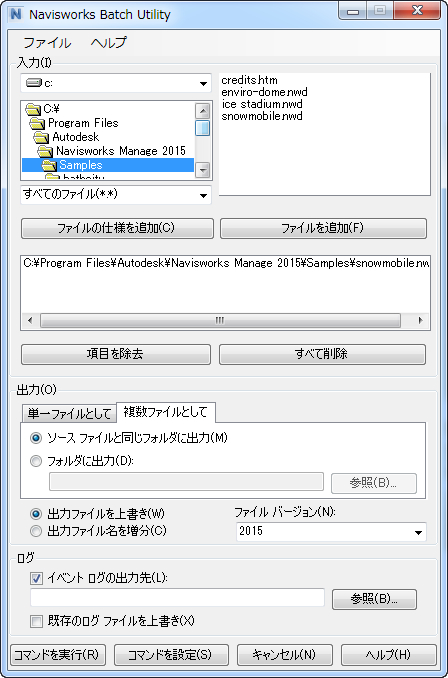 [バッチ ユーティリティ] または、[ファイルの仕様を追加]ボタンをクリックすることもできます。これにより、Autodesk Navisworks は選択したフォルダにあるファイルを変換します。[ファイルの種類]メニューで選択したオプションによって、どのファイルが変換されるかが決まります。