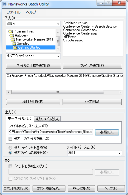 - [Autodesk Navisworks バッチ ユーティリティ]ダイアログ ボックスで、[コマンドを実行]ボタンをクリックします。