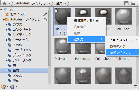 2. [マテリアル]タブで、マテリアルの見本を右クリック [追加] マテリアルを追加するライブラリの名前を選択します。カスタム ライブラリが存在しない場合は、事前に作成する必要があります。