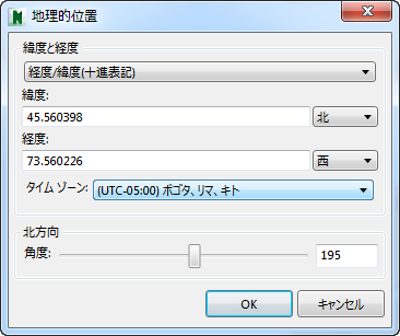 このダイアログ ボックスでは、モデル内の地理的位置の緯度、経度、および北方向を設定します。[シーン ビュー]は、カスタマイズした時間帯におけるカスタマイズした太陽の位置を表示します。