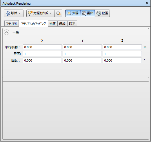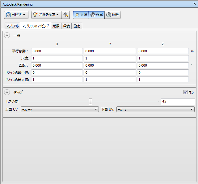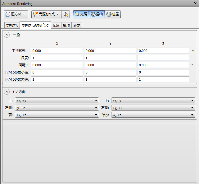 マテリアルマッピングは、3D 座標および法線をを 2D テクスチャ座標(UV)に変換する方法を定義します。これは、テクスチャマップから、色などを確認する場合などに使用されます。各固有のマッピングは、マッピングを行う方法により、「レシピ」が異なります。3D 点をテクスチャ座標に変換する特定マッピング タイプのレシピを適用する前に、[一般]セクションの[移動]、[尺度]、および[回転]フィールドで、3D 座標および法線に適用する変換を定義します。[領域の最小値]と[領域の最大値]の各フィールドの値は、多くのマッピング レシピで使用され、座標空間(X、Y、Z)を 0 ~ 1 (最小値と最大値)にマッピングする範囲を決定する場合に使用されます。