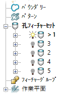 - 孔フィーチャーセット 1 をアクティブにし、その他の全孔フィーチャーセットを非表示にします。