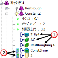 次図の例では、ブロック、AC、RestRoughing が、計算済みの ストックモデル 状態です。したがって、ブロック ストック モデル 状態に対して 後で工具を適用 オプションを使用すると、AC および RestRoughing ストック モデル 状態が無効になります。