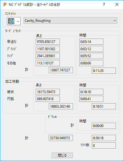NC プログラム統計 - 全ツールパスの合計ダイアログが表示されます。