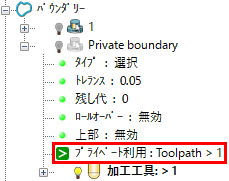 プライベートバウンダリーを使用してツールパスを作成すると、ツールパスがバウンダリーの所有権を制御し、バウンダリーはエクスプローラーのバウンダリー分岐から消去されます。ただし、エクスプローラーの個別のツールパス項目、および、ツールパスダイアログの トリム ページから、当該バウンダリーにアクセスすることができます。