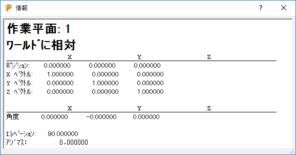 プロパティ - ワールド(グローバル座標系)に相対し、アクティブ作業平面の方向を表示します。