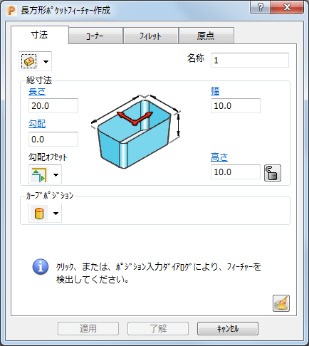 長方形ポケットフィーチャー作成 ダイアログが表示されます。