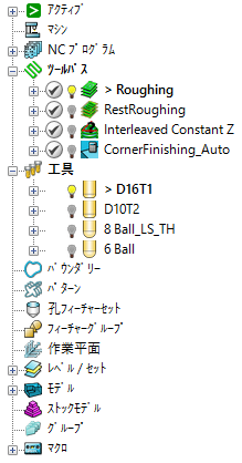 ツールパスなどのエンティティを作成する場合は、工具、作業平面、バウンダリー/パターン(およびツールパスがポストプロセスされる必要がある場合は NC プログラム)などのその他のエンティティを選択する必要があります。これら他のエンティティがアクティブになっている場合、それらは自動的に選択されます。